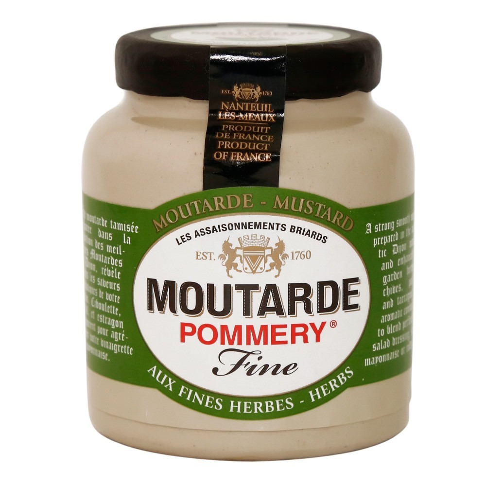Mostarda com Ervas Pommery com grãos de mostarda, vinagre, água, sal, estragão, salsa, conservador bissulfito de sódio. Sem glúten.