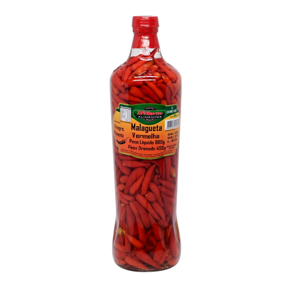 Ingredientes: Pimenta malagueta vermelha, água, vinagre, sal, conservantes permitidos
